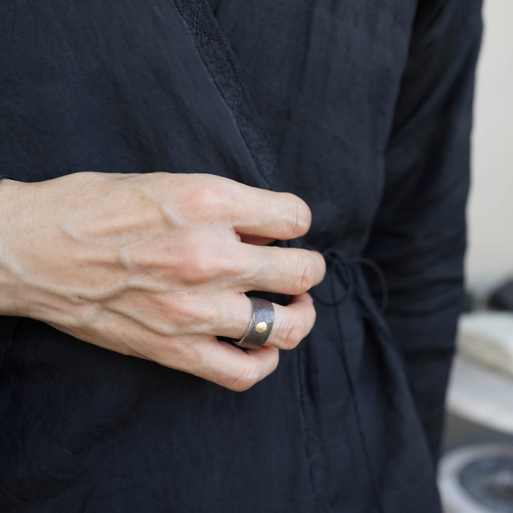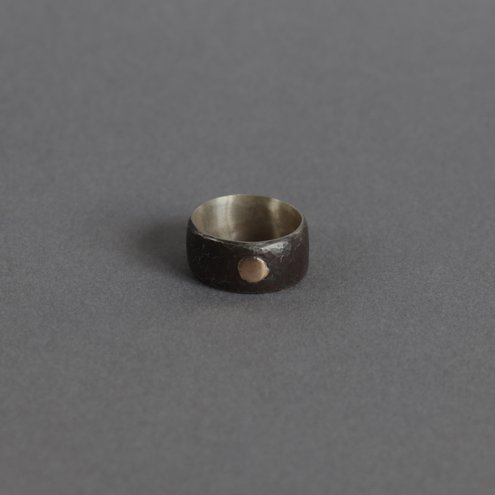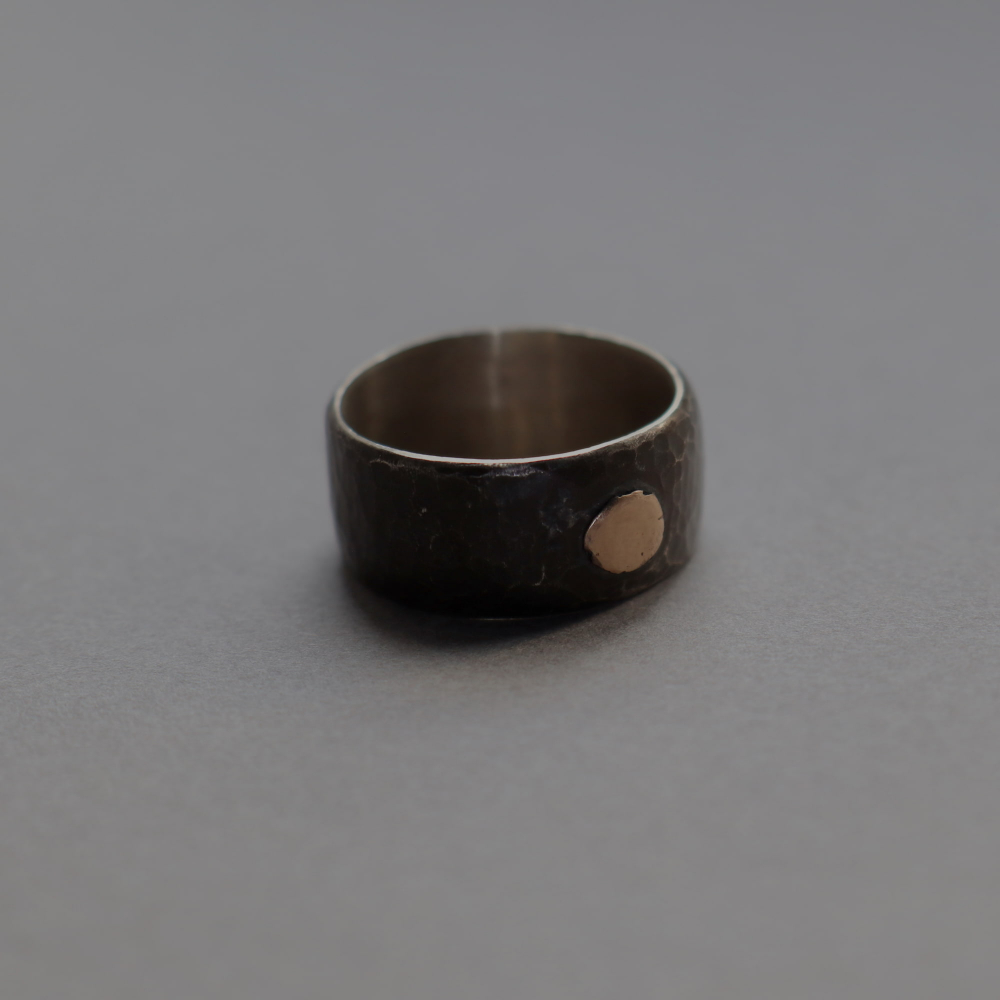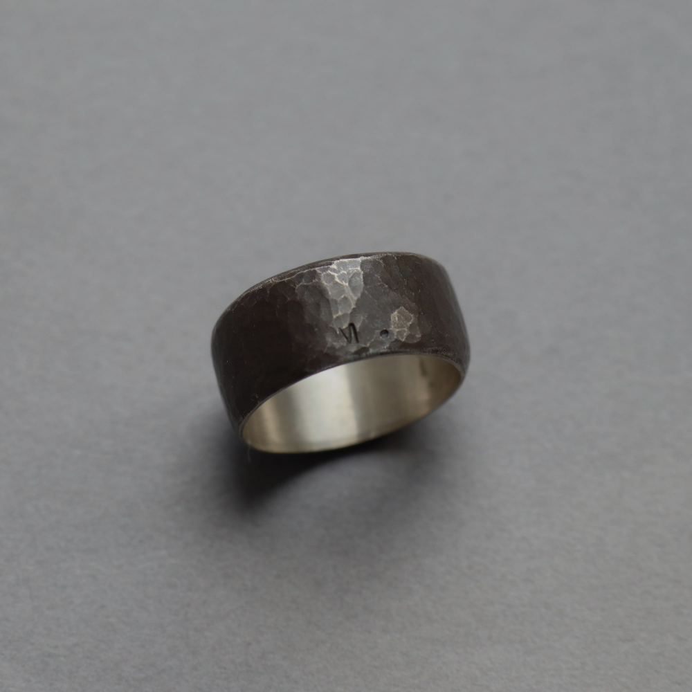 ハンマード仕上げに"いぶし銀"加工を施したリングはマットな表情。メラニーの燻しは柔らかなブラウン系です。ややふっくらとしたボディでハンマードしたエッジにわずかな「あたり」が出ており、良い風合い。