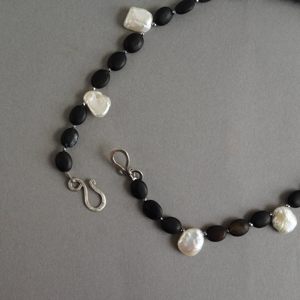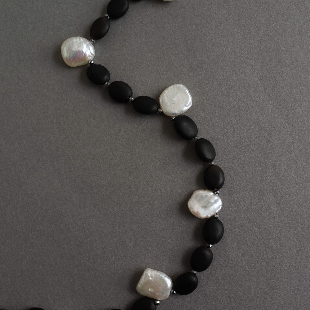 黒いガラスのように見えるビーズはアゲート(瑪瑙)。光を通すと小さな楕円形に鉱物らしい表情が現れます。
