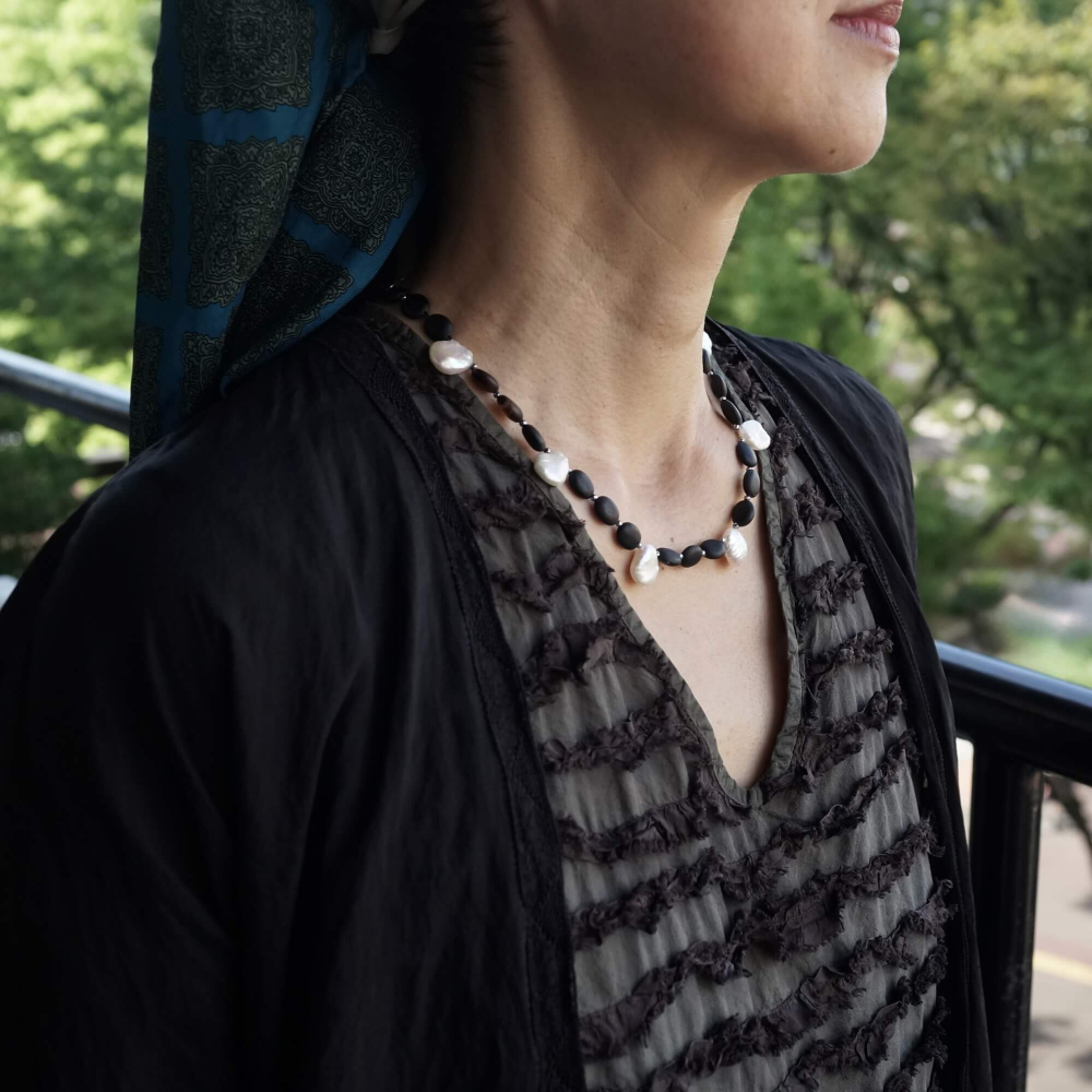 一定の間隔で異素材を繋ぎ、ネックレスのリズムを作る感性はユニークなもの。