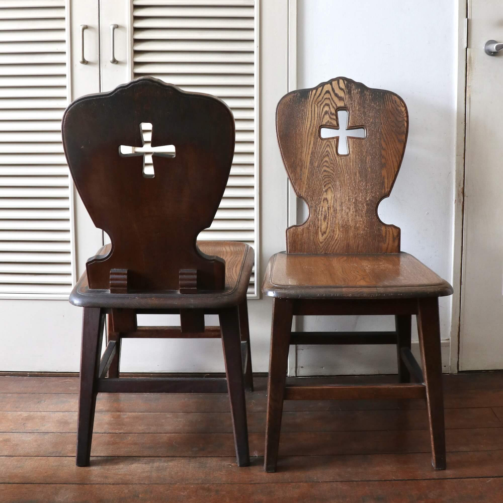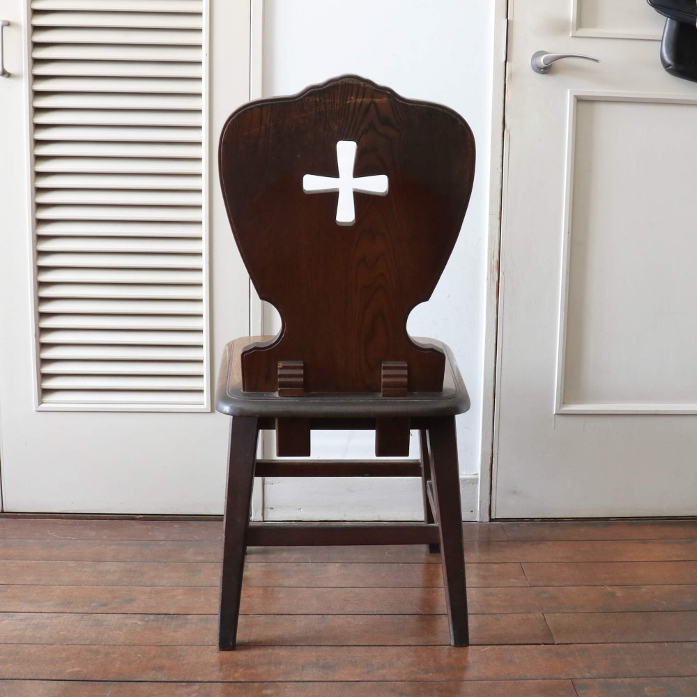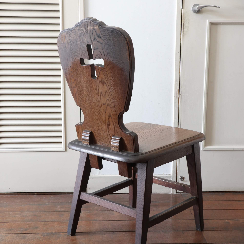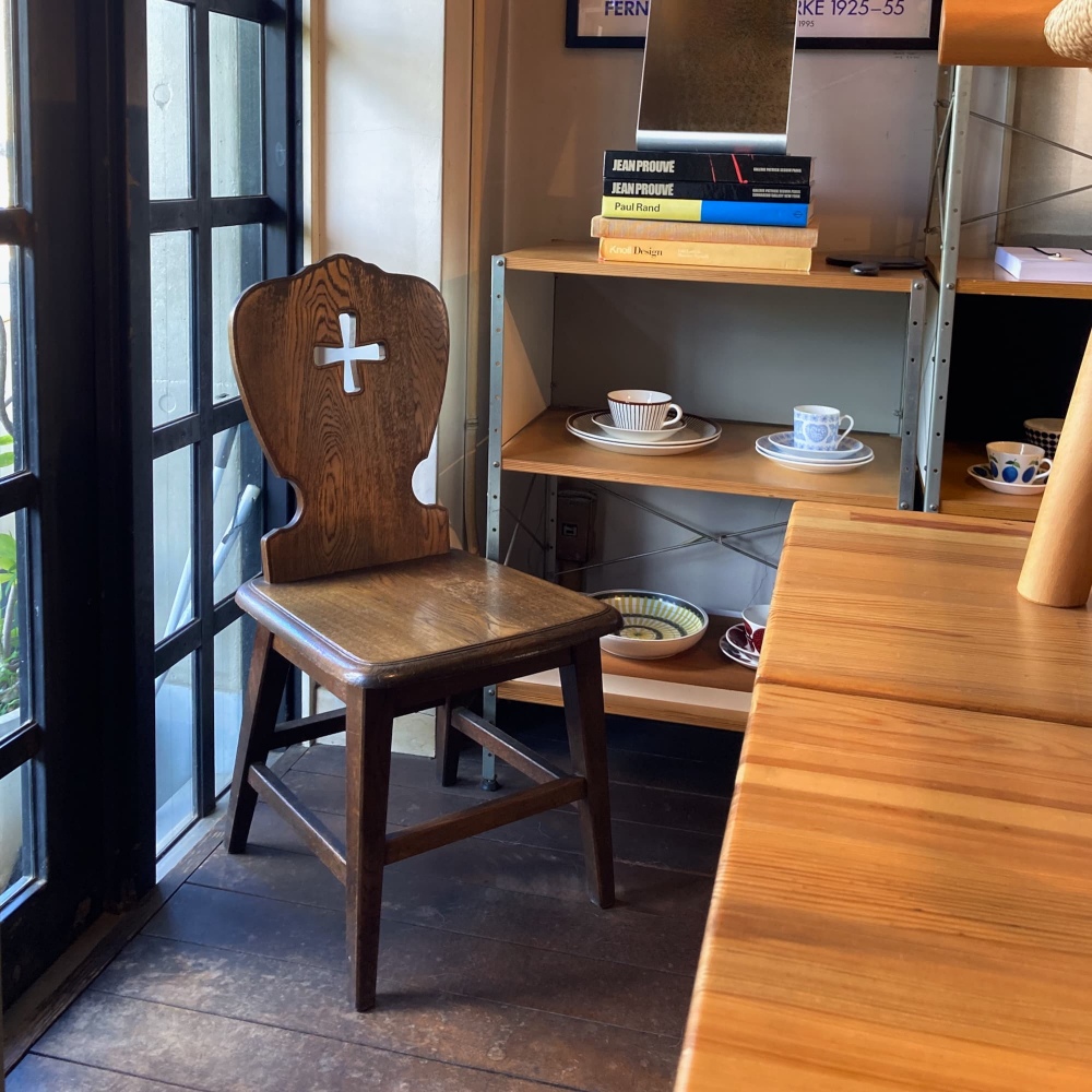 背板に十字のシンボルが穿たれた木製の椅子。なんだか、教会や十字軍をホウフツさせるようなアイコンが際立つ一脚は、立派な日本製のクラフトです。organがあるビルの一階のパスタ屋さんにあった40数年前のものなんです。不特定多数の人が使った歴史が感じられて、捨てがたい魅力があります。