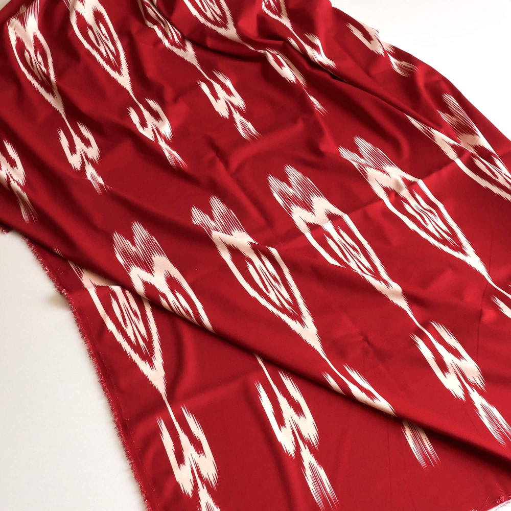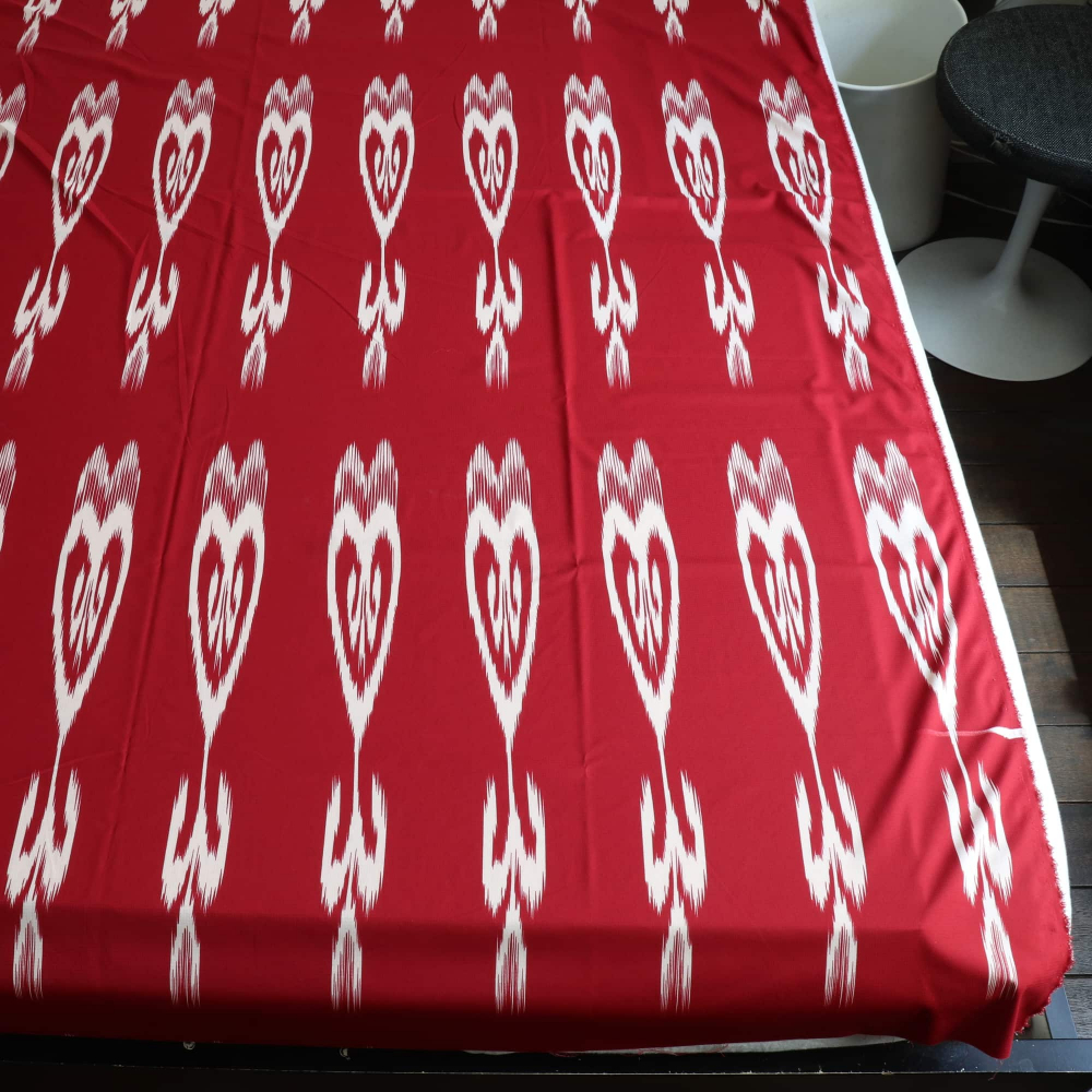 今回、庶民的な市場で買い付けたテキスタイルは、そのアトラス絣がプリントされたシックなデザインのテキスタイル。シルクではありません。化繊生地で少し肉厚。程よいとろみと重みのある布です。