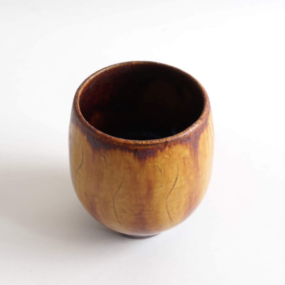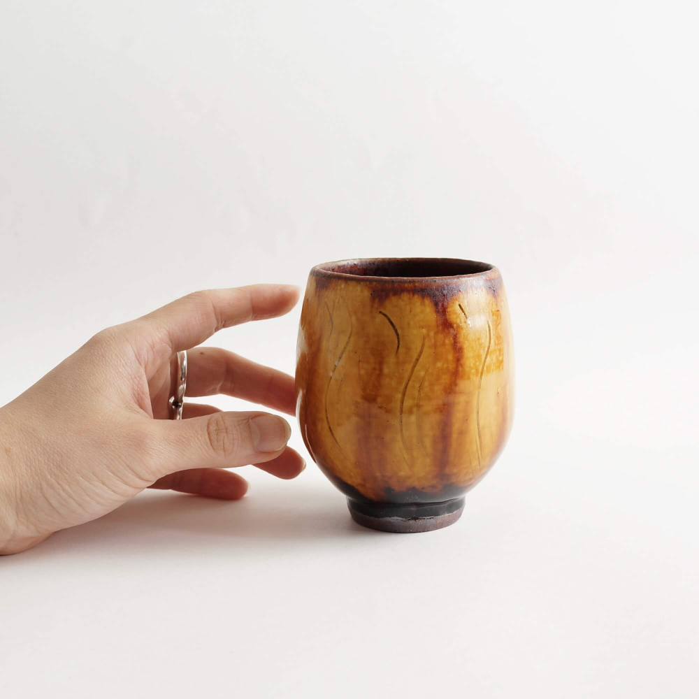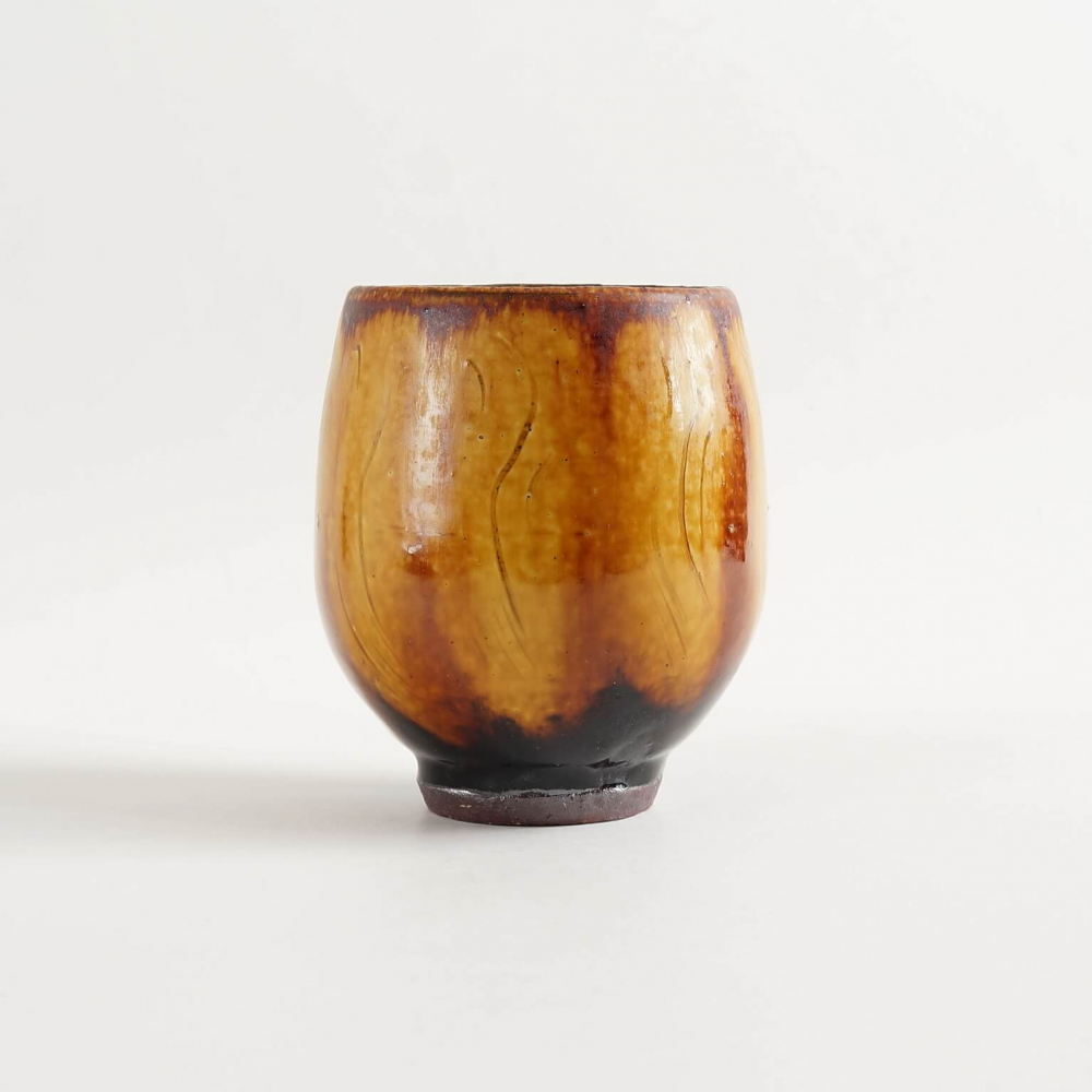 こちらは「ガレナ釉薬」と呼ばれるスリップウェアに特有の黄色い釉薬を用いて、独自に変容したかのような茶碗。加えて、いわゆるスリップウェアのスタイルと違い、「指描き」と言われる手法を使って、文字通り指で描いたようなオモムキ。”あやかな”色調を持った佇まいが、洋の東西をヒョイと越えた異色の風景となっているかのようです。