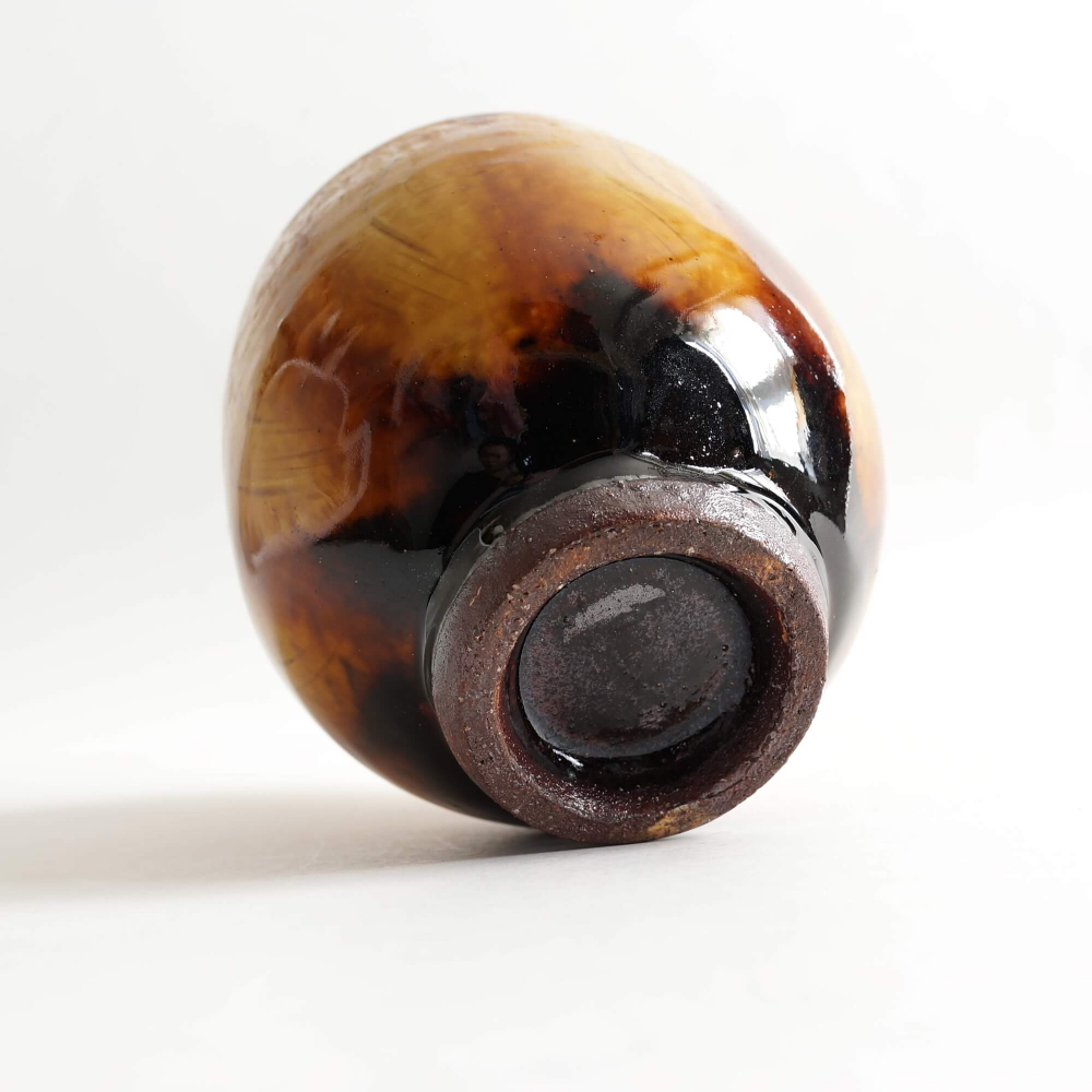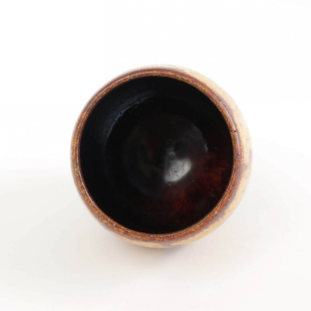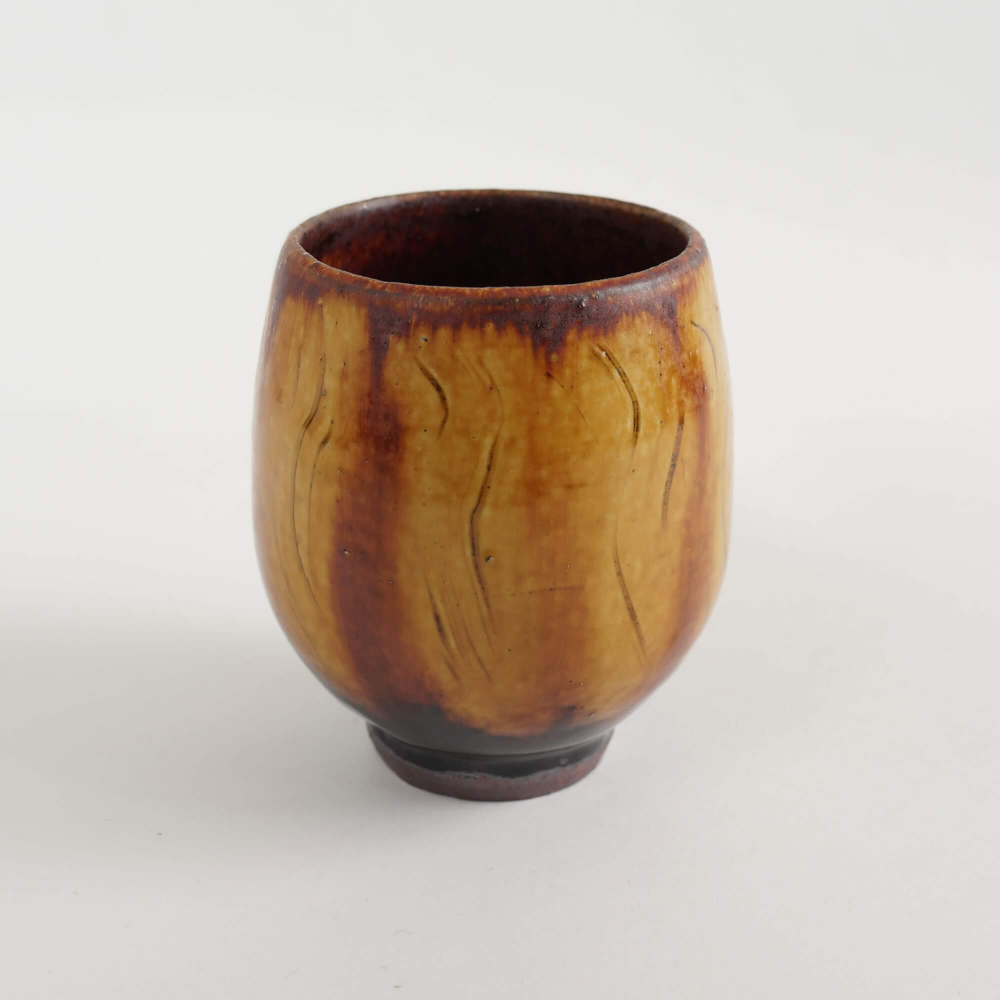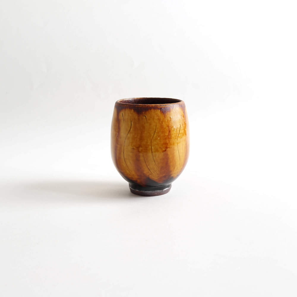 こちらは「ガレナ釉薬」と呼ばれるスリップウェアに特有の黄色い釉薬を用いて、独自に変容したかのような茶碗。加えて、いわゆるスリップウェアのスタイルと違い、「指描き」と言われる手法を使って、文字通り指で描いたようなオモムキ。”あやかな”色調を持った佇まいが、洋の東西をヒョイと越えた異色の風景となっているかのようです。