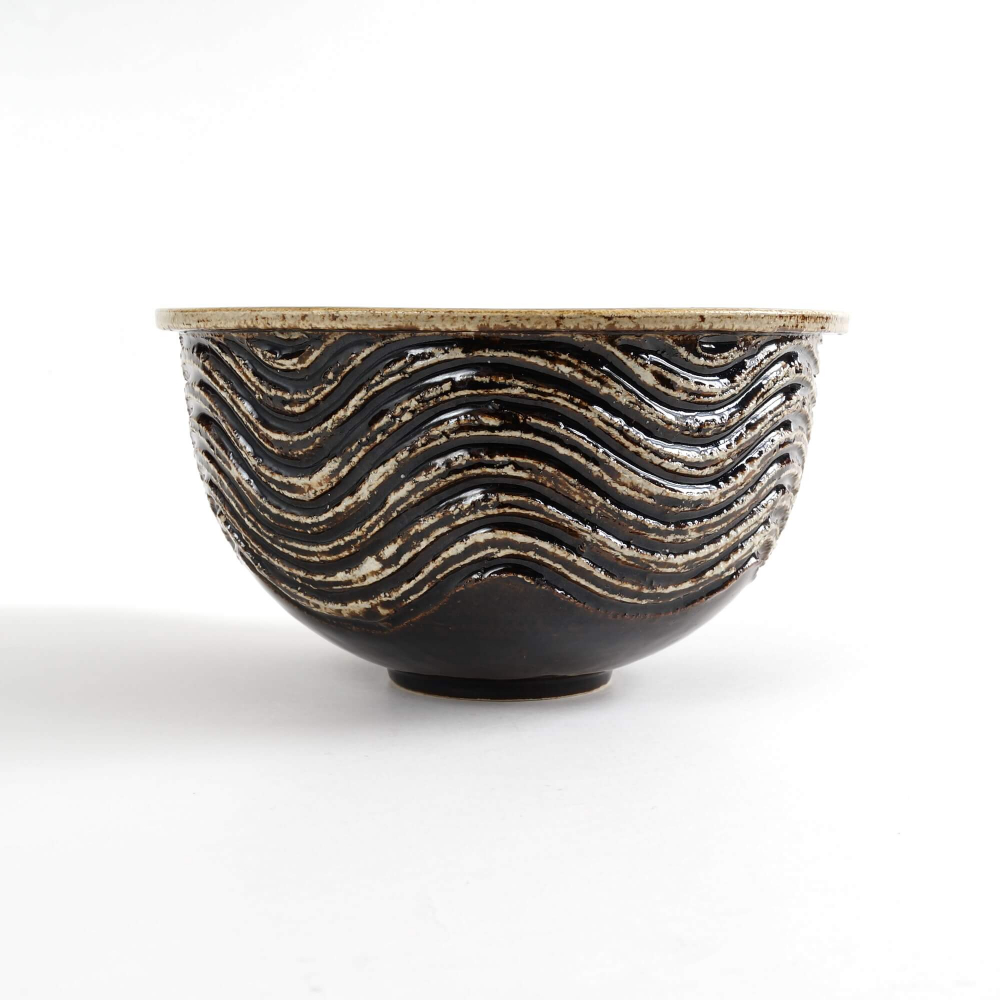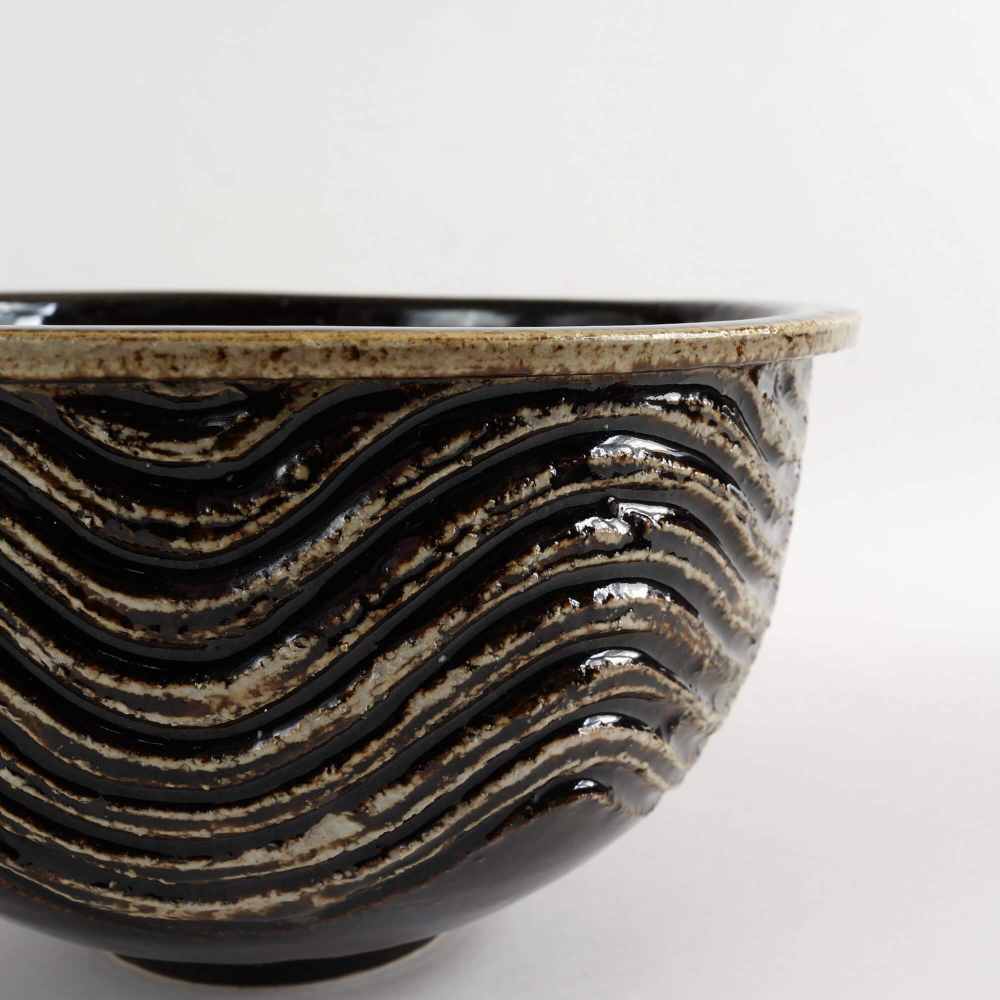 古代の遺跡から出土したかのような波打つ模様と、1,3kgの重さを持つこのボウルは、作家としてのBritt-Louise Sundellをよく表しています。その特徴は、陶器と磁器の中間にあたる性質を持った焼成法にあります。それは、陶土に”シャモット”と呼ばれる細かい砂を混ぜ、独特のざらざらした質感を生み出す手法で、単独のクラフト感を生み出しています。