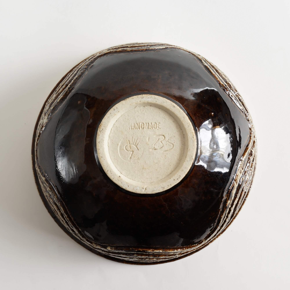 波打つ太い線に、欠けたように見える箇所がありますが、いずれも釉薬が載っていますのでダメージではなく、生成時にできたものです。作家とスタジオワークのサインがあります。コンディション良好。