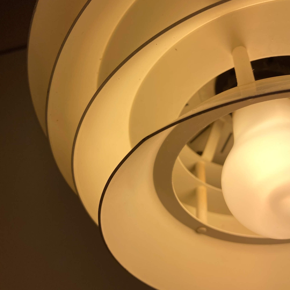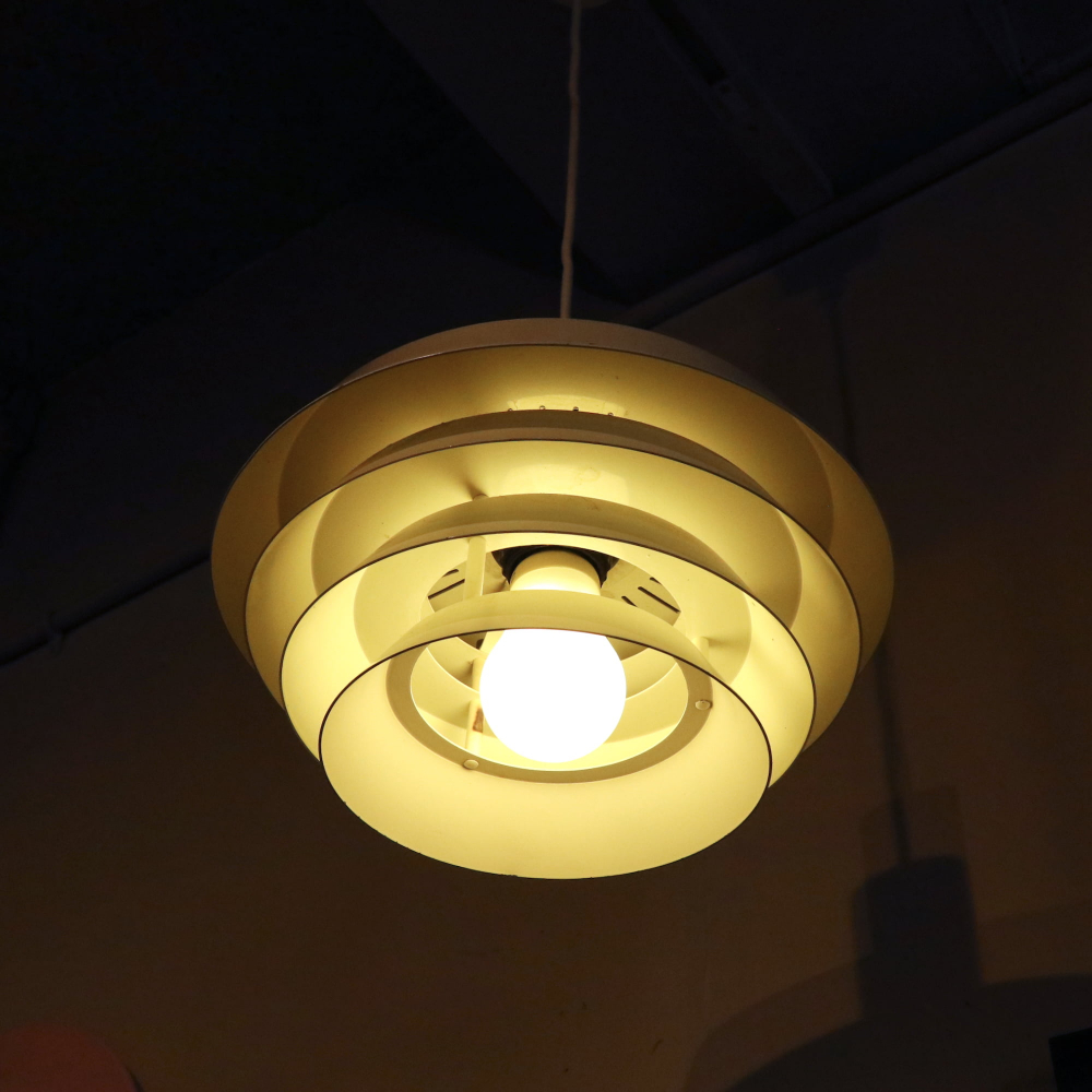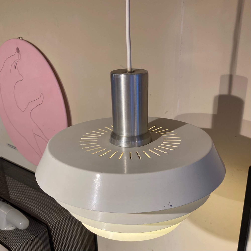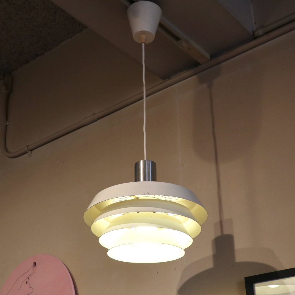 1970年代後期にSven Middelboeがデザインし、当時人気を博したペンダントランプ "VERONA"を意識したのでしょうか、それよりもコンパクトなサイズで、とても愛らしい印象。おそらく1980年代頃に製作されたもの。支柱はメタルカラーで、シェードはホワイト。プライベートな空間にどうぞ。