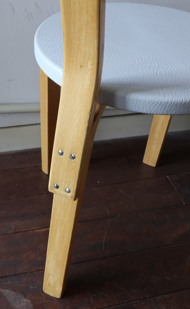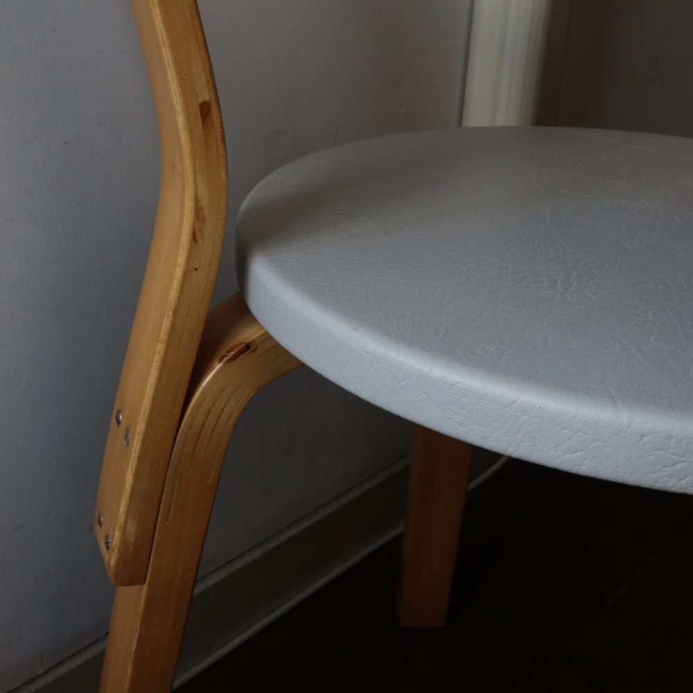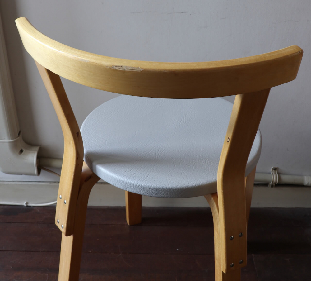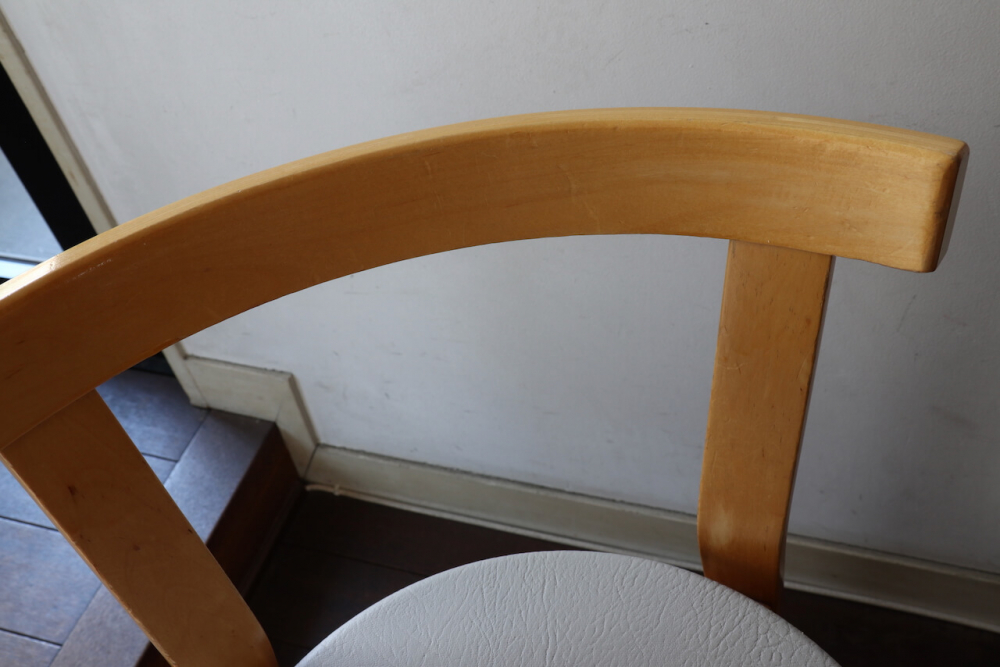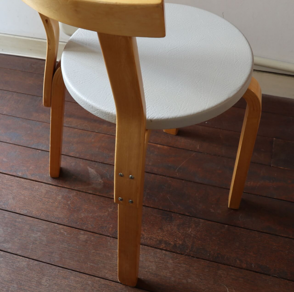 実のところ、アアルトのチェア中、掛け心地が良く、強めにラウンドした背もたれが特徴で、ダイニングチェアとしてイチオシなのがこちらです。今回紹介するものはシートにヴァイナルレザーを使ったArtekのオリジナル。マイナスビスと脚の4本スリットが使用されているため1960年代のものと判断します。