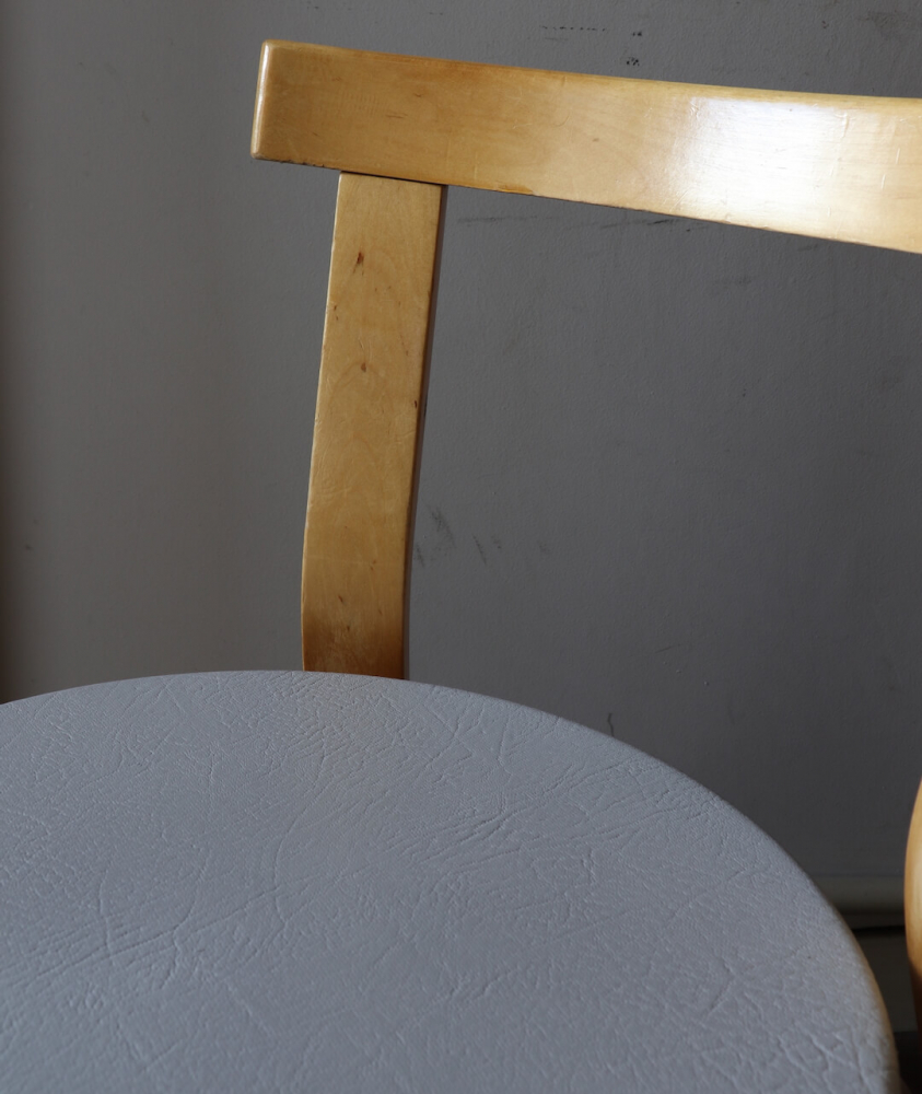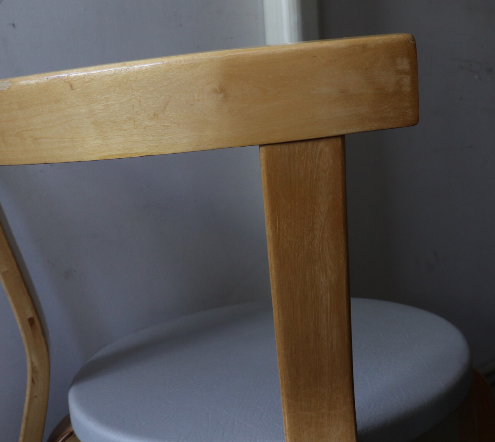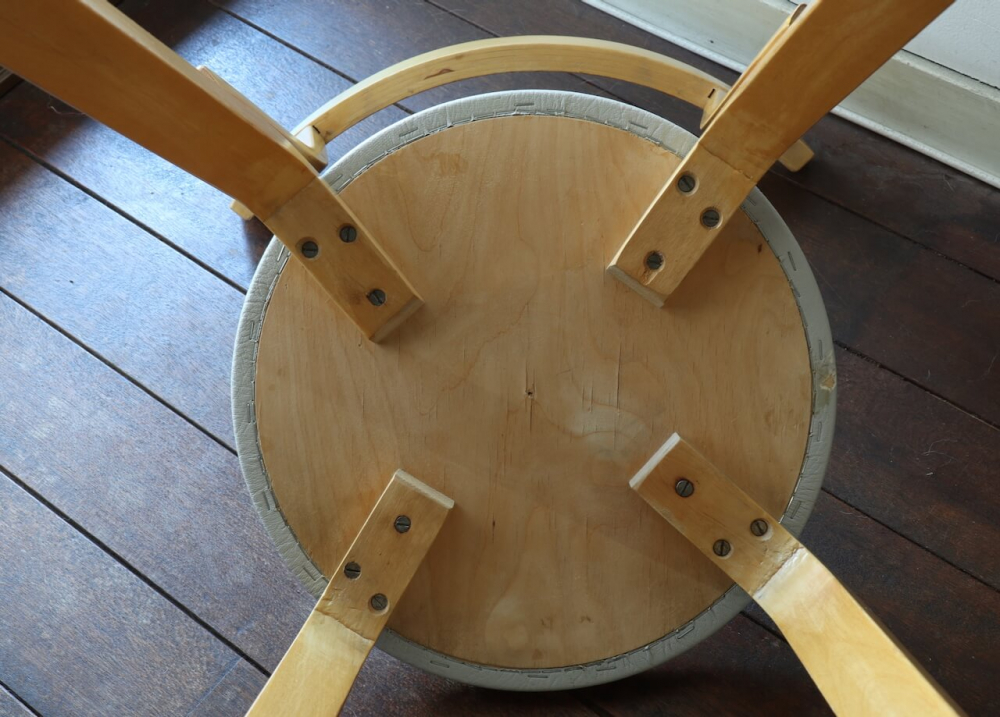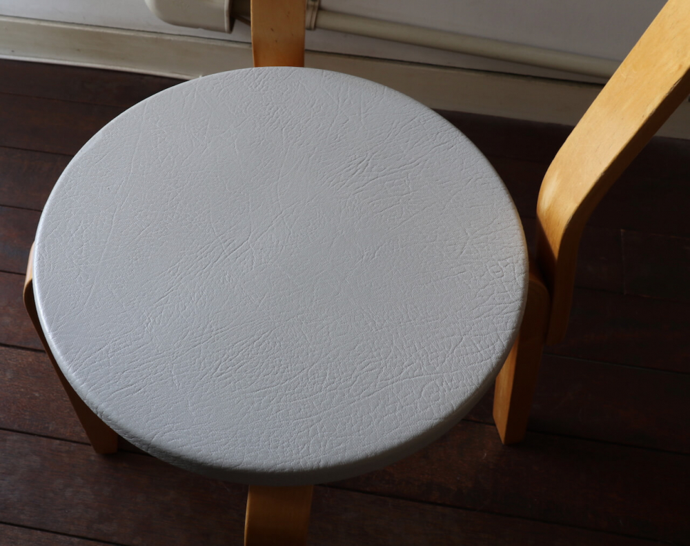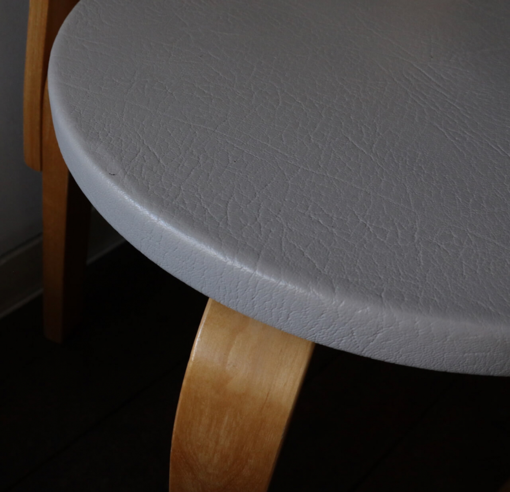 実のところ、アアルトのチェア中、掛け心地が良く、強めにラウンドした背もたれが特徴で、ダイニングチェアとしてイチオシなのがこちらです。今回紹介するものはシートにヴァイナルレザーを使ったArtekのオリジナル。マイナスビスと脚の4本スリットが使用されているため1960年代のものと判断します。