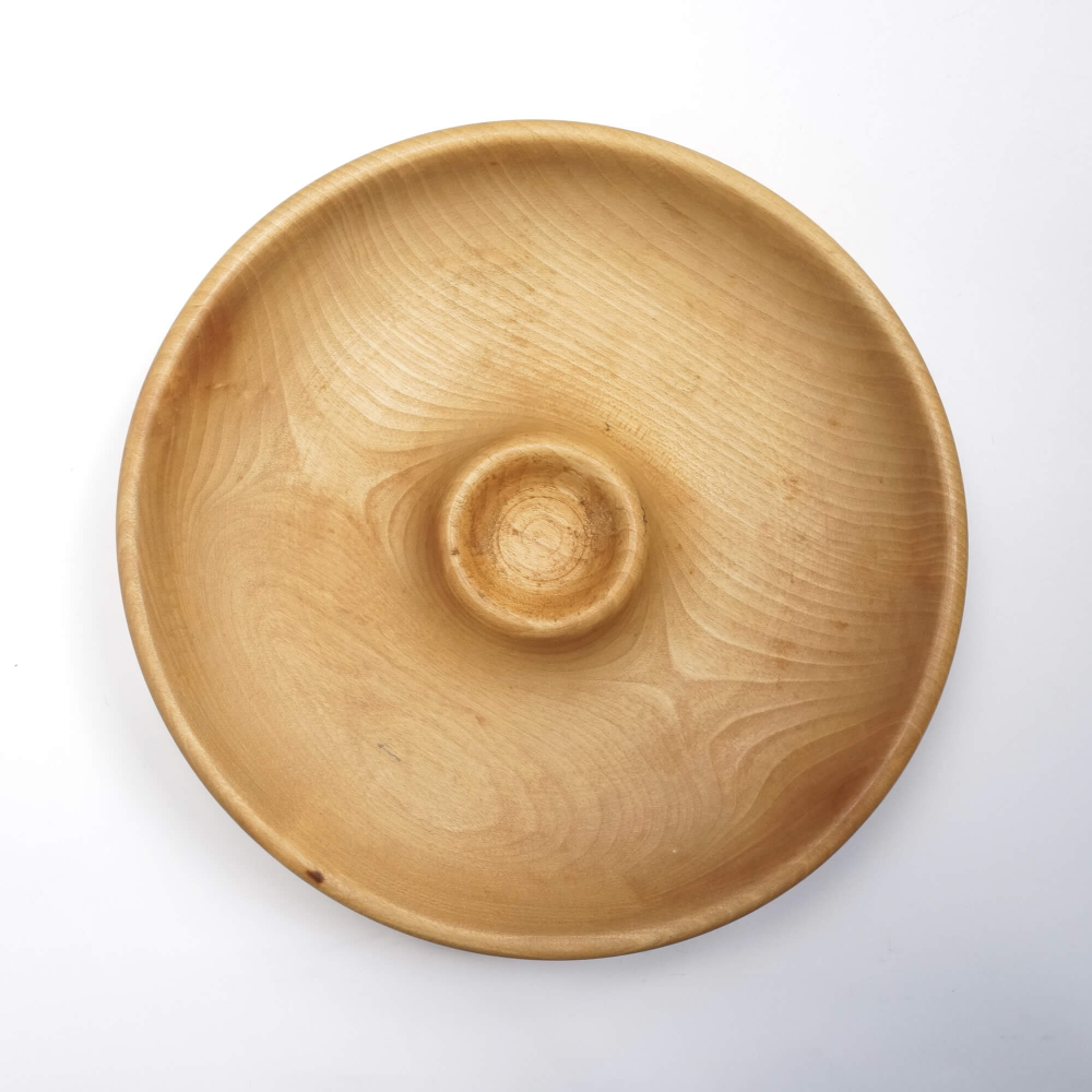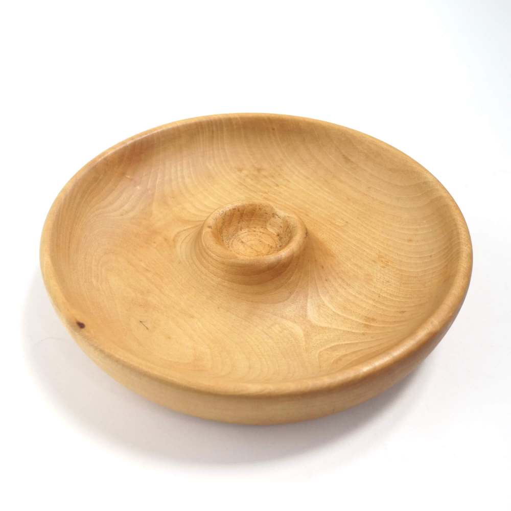 確かにオーボックの作品に、これに類似した形状のフルーツボウルがあります。使い方は、真ん中の穴に球体のコルクを装填し、そこにフルーツフォークを何本か刺し、それを使って盛り付けた果物をいただくという”ウインナー・スタイル”。ウッドターニングの腕前も立派なものです。真ん中のコルクこそありませんが、形状がとてもユニークなので、どんな使い方をしようかと、妄想が膨らみます。