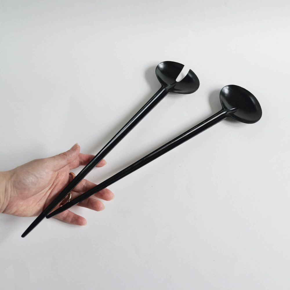 今回ご紹介するのは1960年代にデザインされたサラダサーバー。黒一色のこちらは、直線と楕円のシルエットがとてもグラフィカルな趣に溢れています。