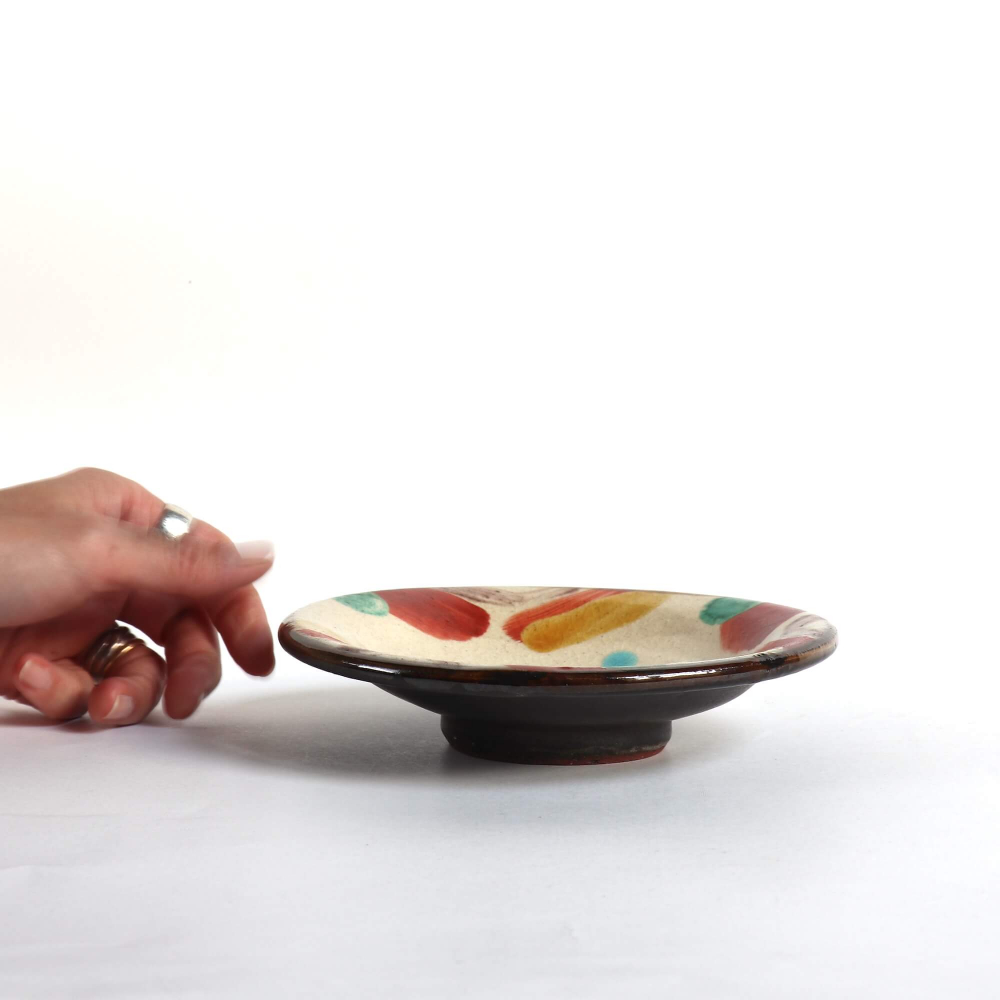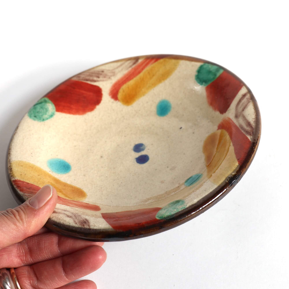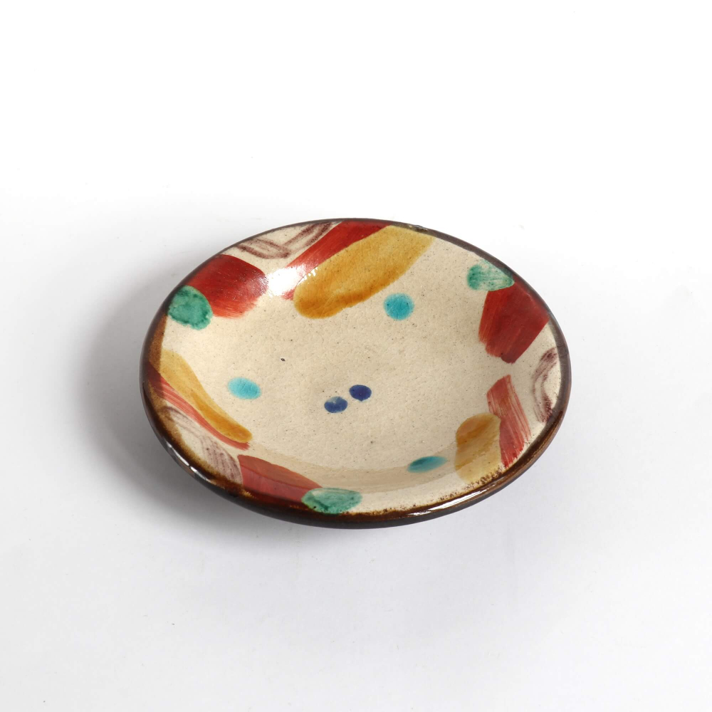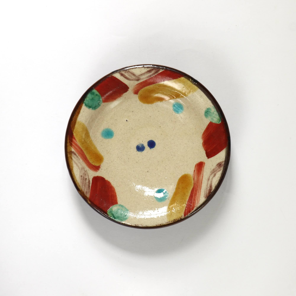 こちらは少し小さめの皿。絵付けの色彩がはなやかで真ん中の点々もご愛嬌。そのせいか京風な「みやびさ」も感じますが、厚手なので庶民的なのです。さて、なにを盛り付けようか。わたしなら「芋の煮っ転がし」で決まり!