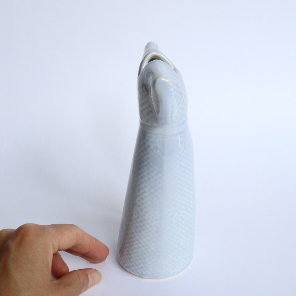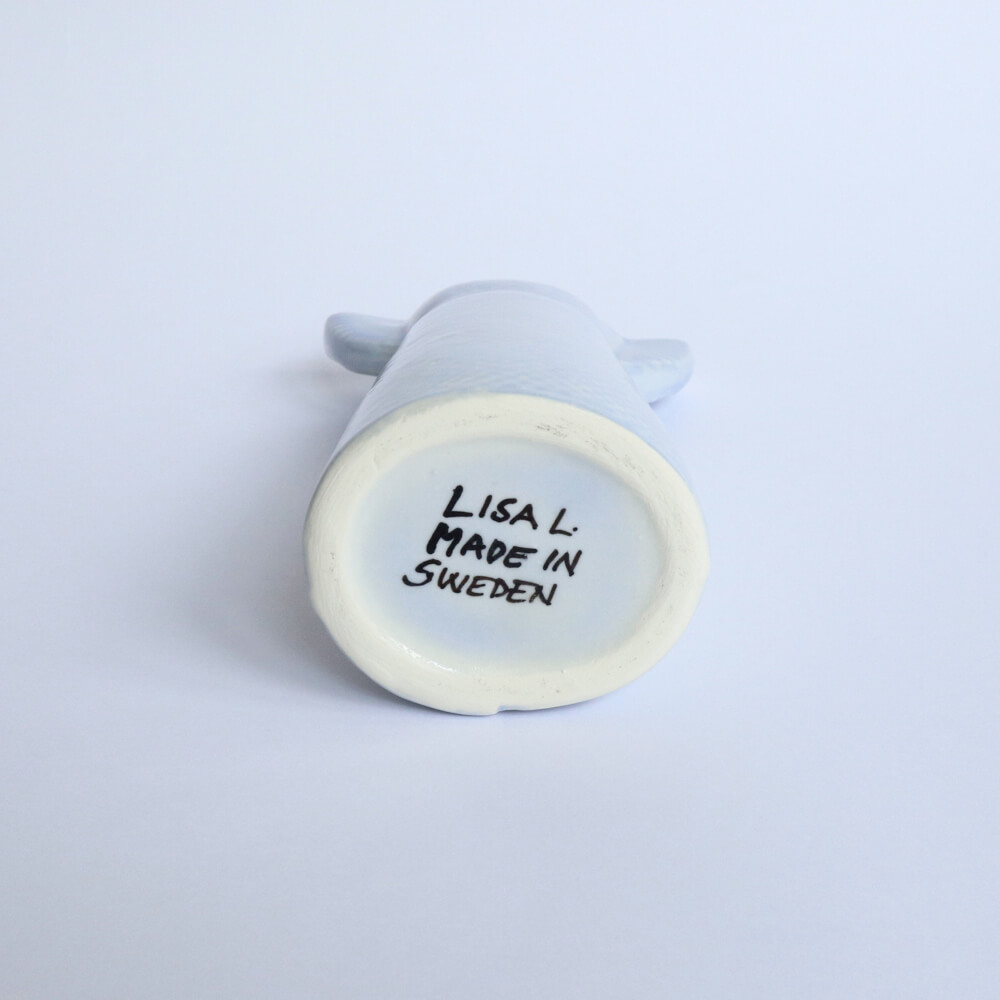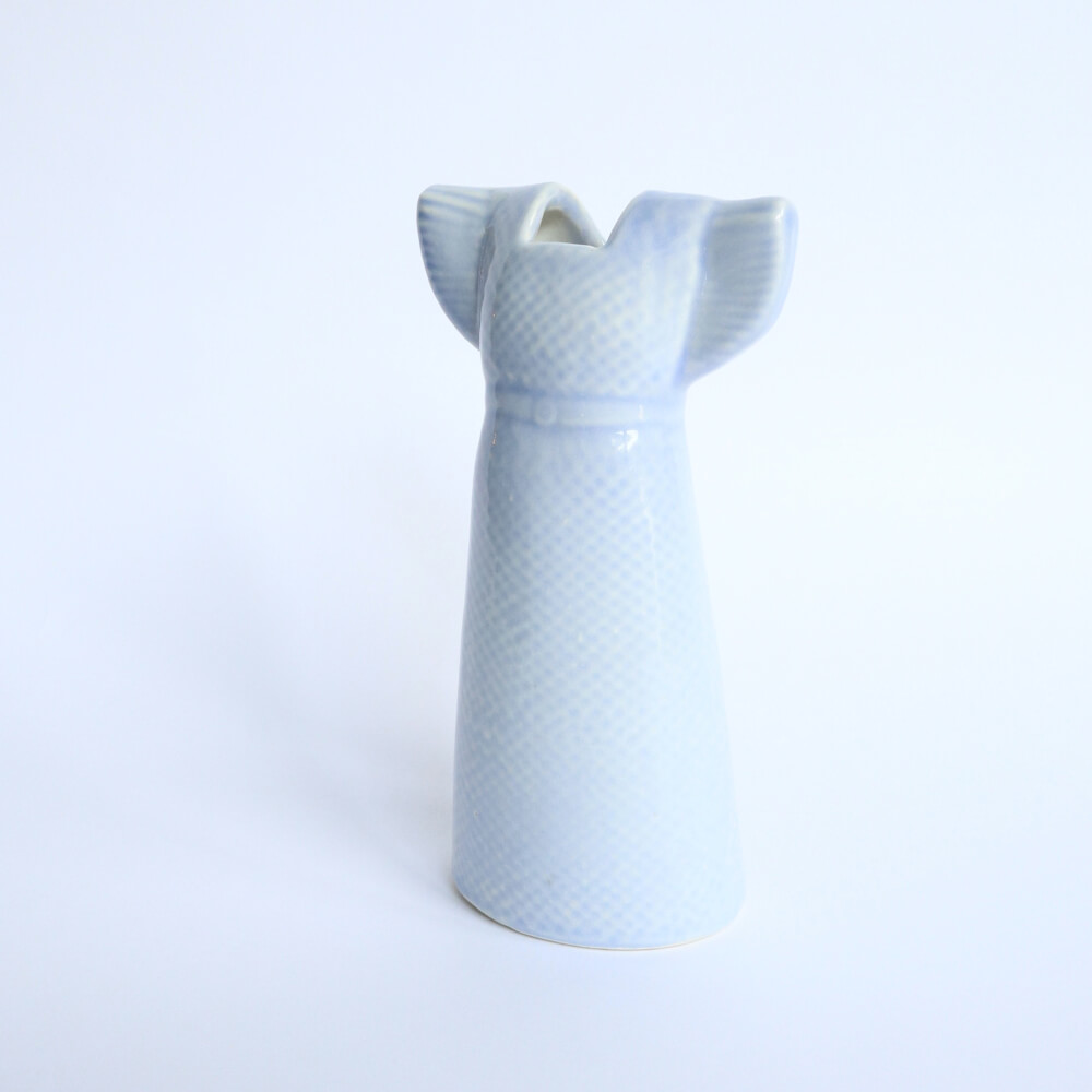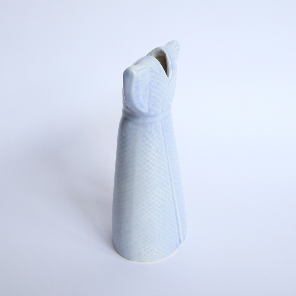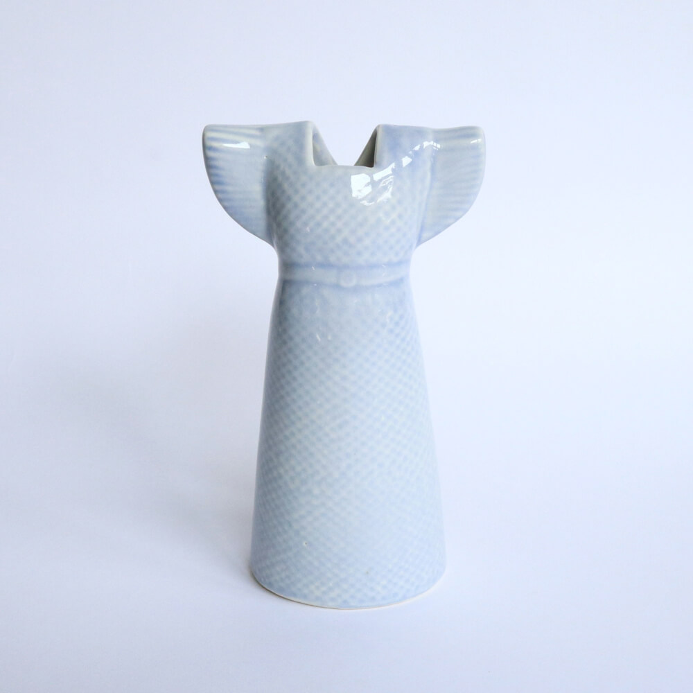 リサ・ラーソンが晩年にデザインしたアイテム、人気の「ワードローブ」シリーズ、ドレス。立体的で、背中からの見た目も美しく、上品なライトブルーがとてもやさしい印象のフラワーベースです。背丈のあるデザインは、実際に花器として使うのにも便利だと思います。